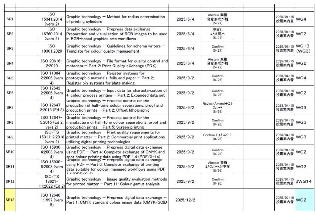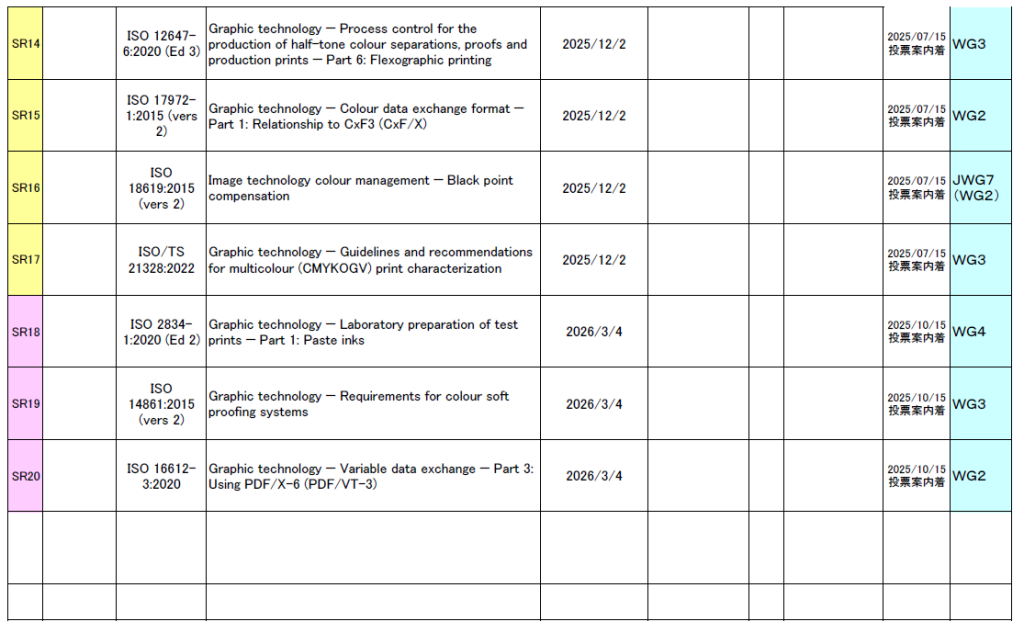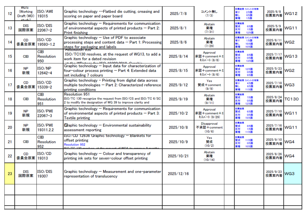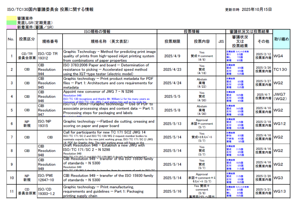 印刷産業技術に関わる国際規格ISO/TC130の規格審議に関わる投票情報です。投票に関わる利害関係者みなさまへの投票情報の周知に努めています。利害関係がある方はISO/TC130国内審議団体の事務局(特定非営利活動法人日本印刷産業技術標準化推進協議会)までご連絡をお願いいたします。